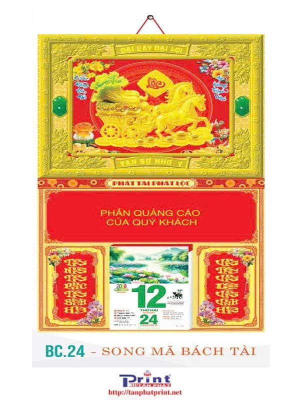MẪU LỊCH BLOC – KHUNG VÀNG DÁN NỔI 3D – SONG MÃ BÁCH TÀI | BC.24