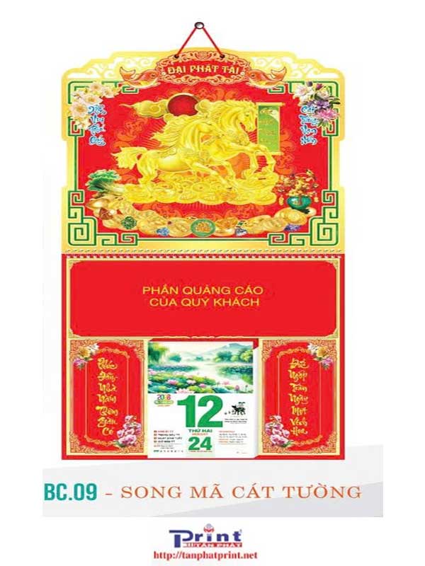 MẪU LỊCH BLOC – KHUNG VÀNG DÁN NỔI 3D – SONG MÃ BÁCH TÀI | BC.24
